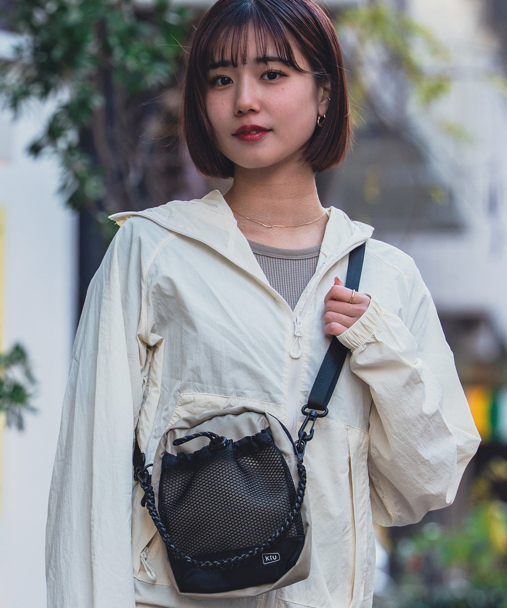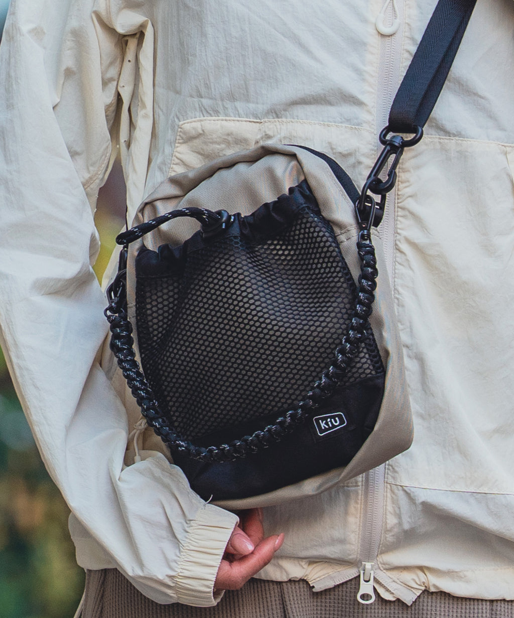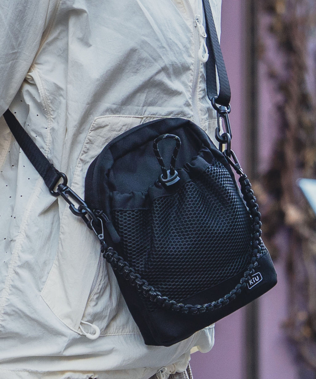 A shoulder bag with a front mesh pocket that can hold a whole 500ml plastic bottle.