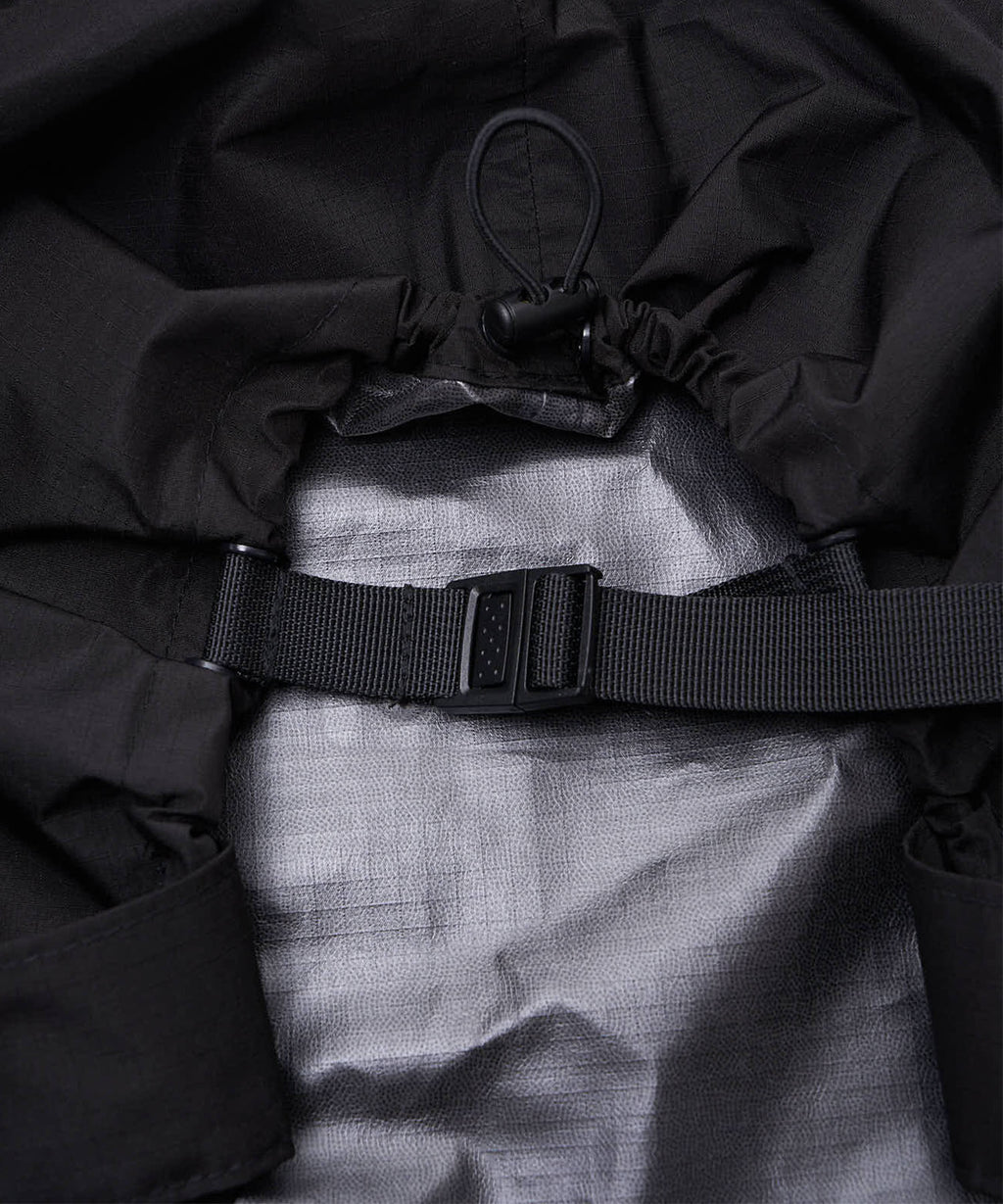 フロント部分のクロスになったドローコードを絞ることで、中のバックパックにフィットさせることができ、内側にバックルが付いているので繋げることで外れることなく使用いただけます。