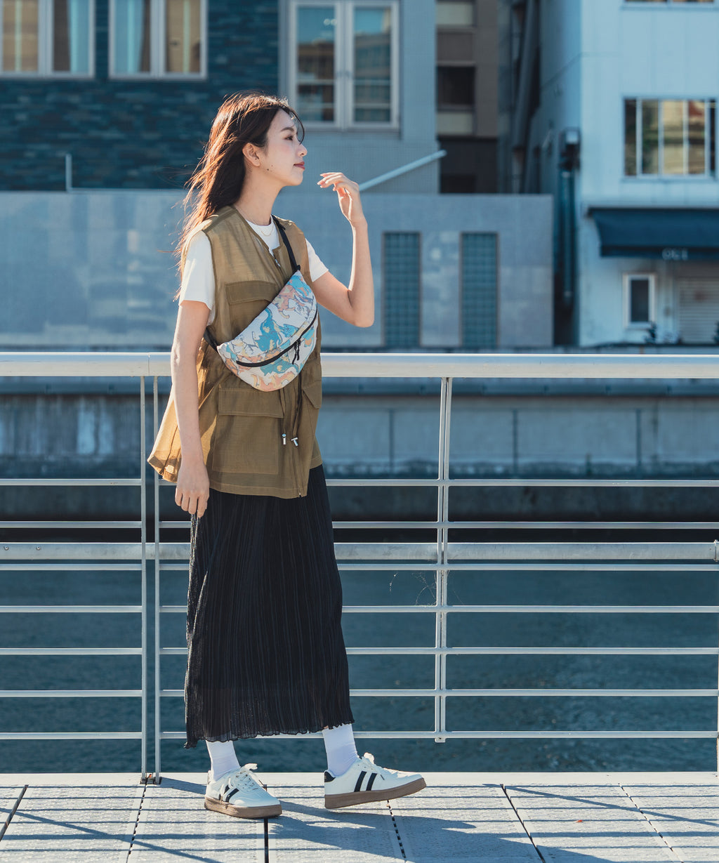 雨水を弾き、小物がたくさん入るので、アウトドファッションにおすすめのアイテムです。
