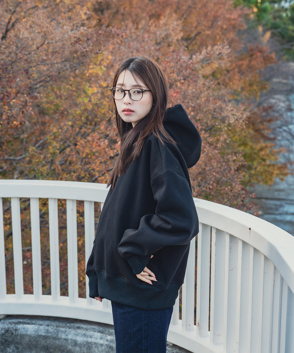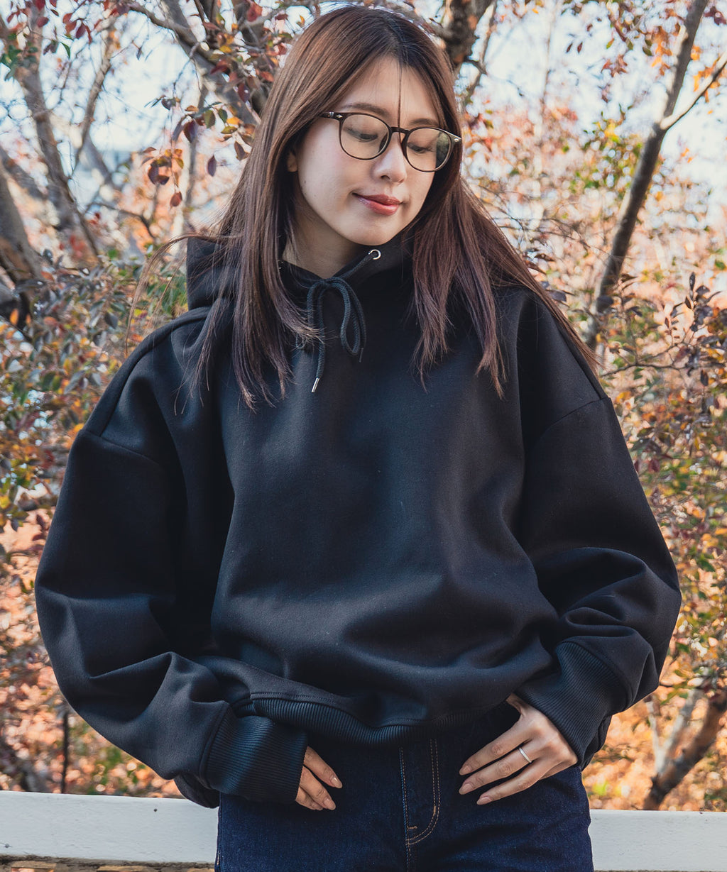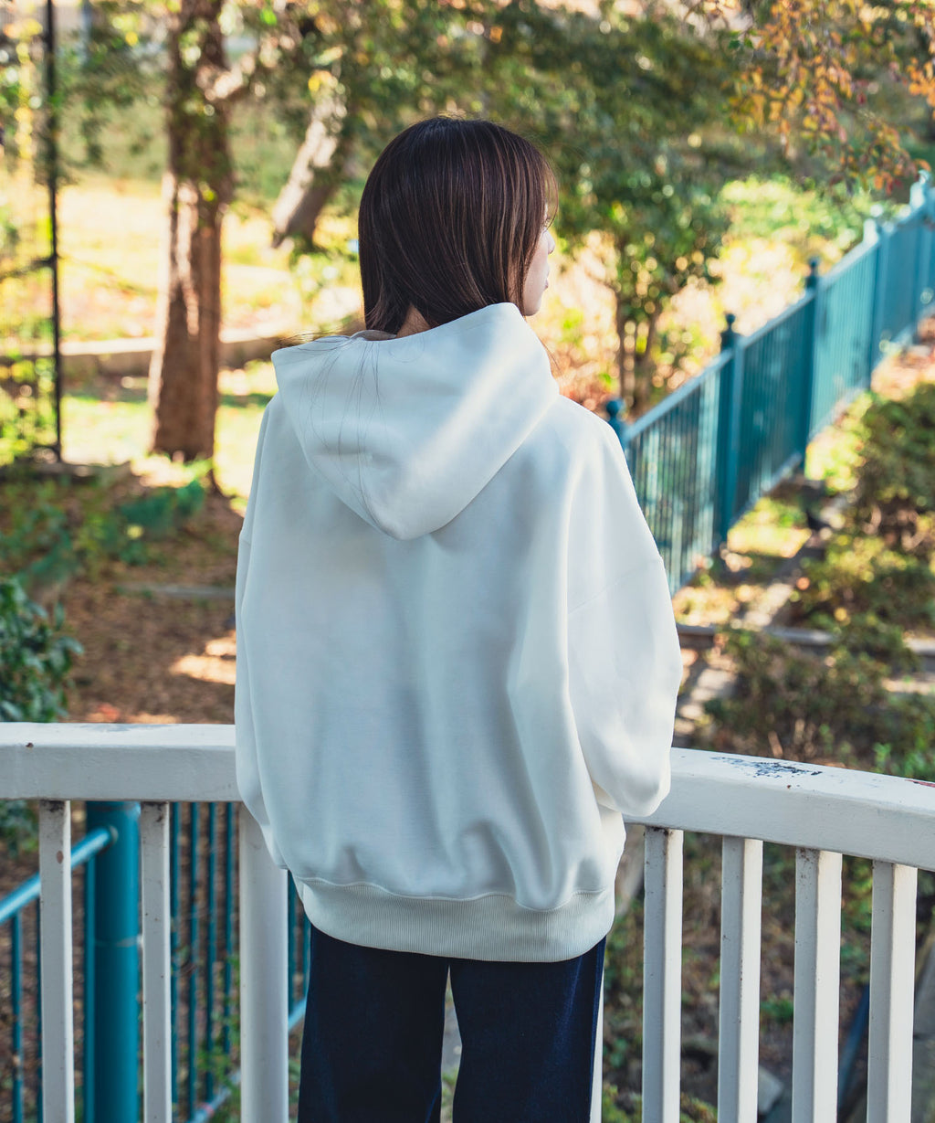 ボックスシルエットでたっぷりと長さのある袖が特徴のパーカーです。